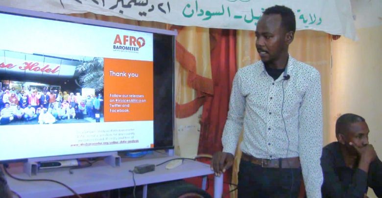 نظم مركز السودان لإستطلاع الراي والدراسات الإحصائية بنادي النهضه بالنوراب محلية المتمة ولاية نهر النيل ندوة (إعلان نتائج حول التغير المناخي وكيفية حماية البيئة) بالتعاون مع شبكة الأفروباميتر تحدث خلالها المهندس عمر إبراهيم عمر مشرف الباحثين بالمركز حيث أشار إلى أهمية توسيع المعرفة بالتغير المناخي وإسهام المجتمع بصورة أكبر في إصحاح البيئة والاستفاده من الدراسات والبحوث في الارتقاء بالواقع البيئي والتحول المناخي مشيرا إلى أن دراسة ندوة إعلان نتائج شملت وتشمل عددا من الدول منها السودان.