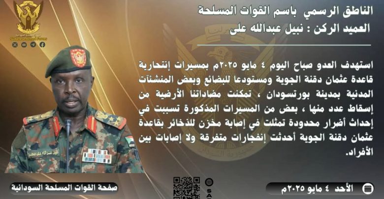 إستهدف العدو صباح اليوم 4 مايو 2025م بمسيرات إنتحارية قاعدة عثمان دقنة الجوية ومستودع للبضائع وبعض المنشئات المدنية بمدينة بورتسودان ،